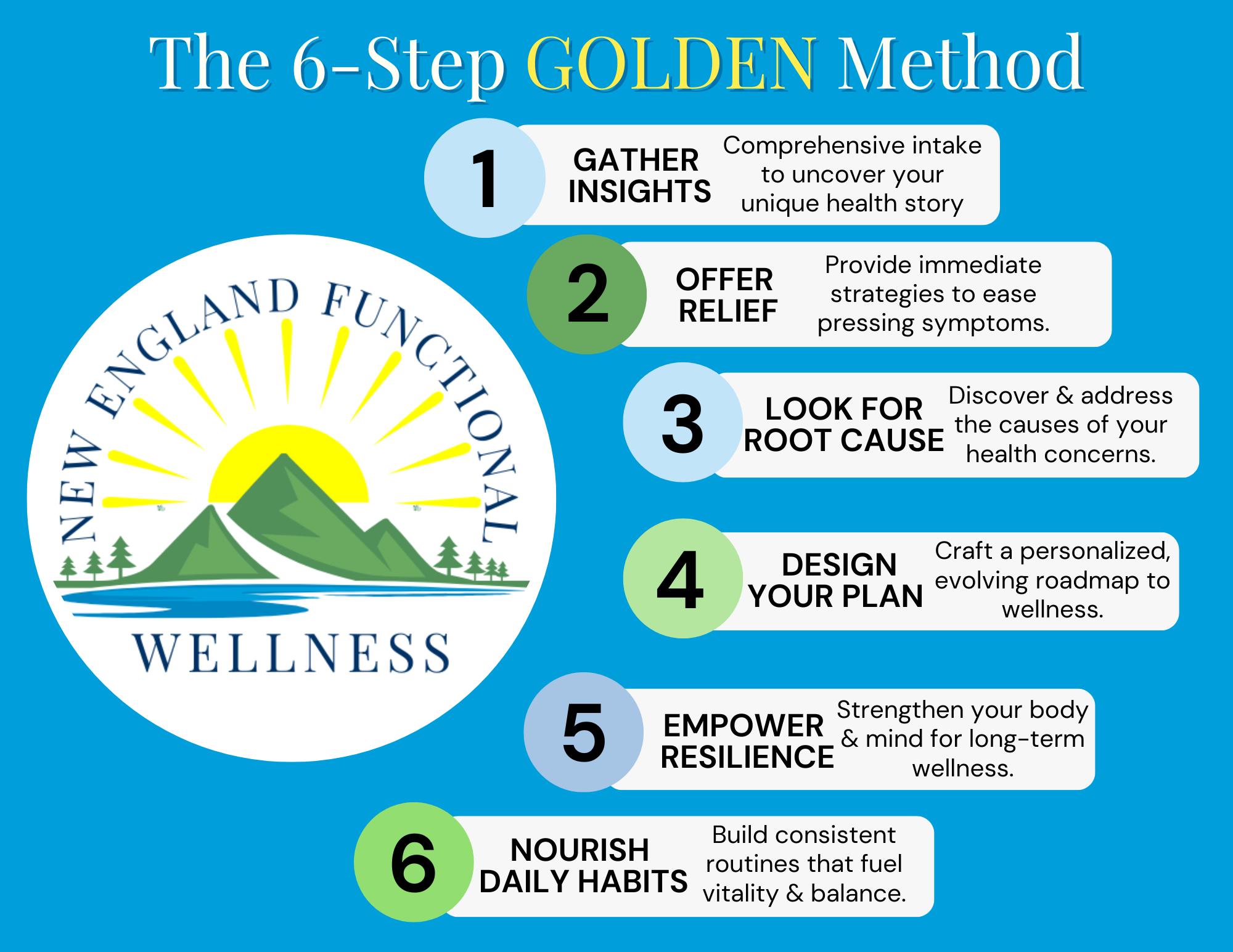 True health isn’t built on quick fixes. At New England Functional Wellness, we use functional medicine to help Massachusetts women in their 40s and 50s uncover the root causes of fatigue, brain fog, and stubborn symptoms — so you can feel your best now and decades ahead. That's where our GOLDEN method comes in. It's more than just a process—it's a tailored approach designed to uncover the unique factors driving your health and empower you to take control of your well-being.